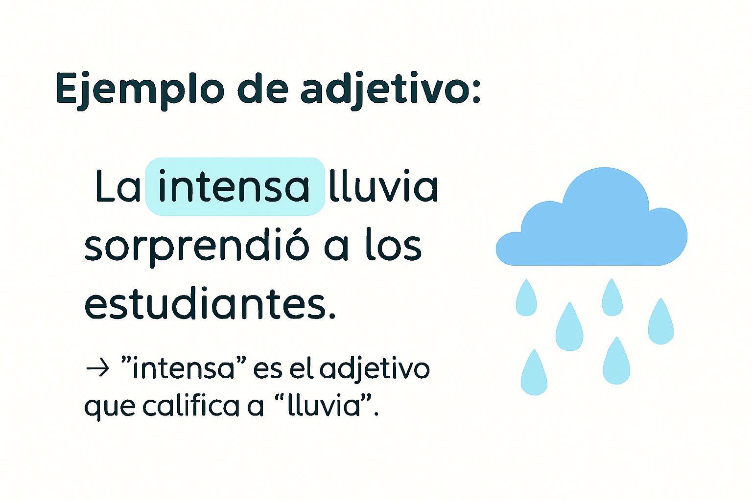 El adjetivo es la palabra que acompaña al sustantivo para calificarlo o determinarlo. Su función es describir cualidades, estados o características del sustantivo, ya sean físicas, emocionales o contextuales. En La intensa lluvia sorprendió a los estudiantes, “intensa” es el adjetivo que califica a “lluvia”, añadiendo información sobre la magnitud del fenómeno. Los adjetivos pueden ser calificativos, demostrativos, posesivos, numerales, indefinidos, entre otros. Su presencia en el discurso permite matizar y precisar el significado del sustantivo, contribuyendo a la riqueza expresiva del lenguaje.
