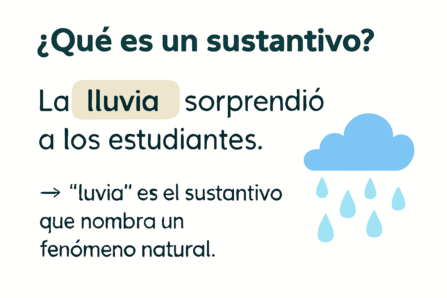 El sustantivo es la palabra que nombra entidades concretas o abstractas. Puede referirse a personas (docente), animales (colibrí), objetos (libro), lugares (escuela) o ideas (justicia). Su función principal es ser el núcleo del sujeto en la oración. Los sustantivos se clasifican en comunes y propios, concretos y abstractos, individuales y colectivos, entre otros. Por ejemplo, en la oración La lluvia sorprendió a los estudiantes, “lluvia” es el sustantivo que designa un fenómeno natural. Esta palabra puede ir acompañada de artículos, adjetivos o determinantes, lo que permite ampliar su significado y especificidad.